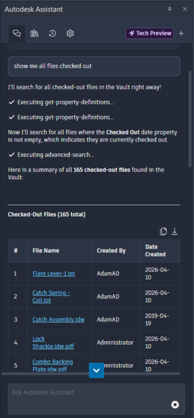 With Autodesk Assistant you can ask how specific features work (for example, “Explain Copy Design”) or search for data using plain‑language queries. For example, asking: “Show me all files checked out by this user”