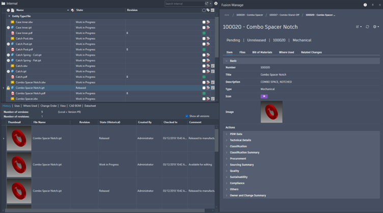 The Fusion Manage window within the Vault client has been refined to make navigation and browsing simpler. Users can view, Item data, PDM information, and property and lifecycle data